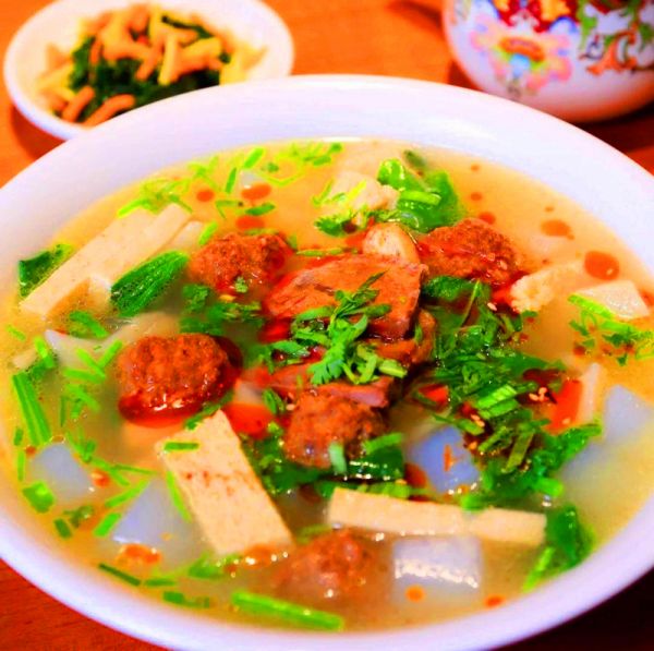 新疆旅游攻略之美食新疆丸子汤又叫三鲜丸子汤。丸子汤的汤可是很讲究的,要把牛肉的牛骨头一起熬制很久才能出来如此美味的高汤。 丸子汤一上来,先喝一口汤,让整个身体都热火起来,口口都透着鲜啊;做丸子也得是绝活,用新鲜牛肉入料,炸熟炖到汤里,外脆里嫩的,口口都透着香啊;再吃块冻豆腐,豆腐里吸足了汤,吃下去真是回味悠长。此外汤里理是精华荟萃,阿魏菇、牛肉片、粉块、粉条、鲜蔬菜等,口十分丰富,有的香糯、有的爽滑、有的劲道。丸子汤还要配上一道新疆名吃:油塔子。据说油塔子是层越多越好,而且拎着“塔顶”可以带起整个,一层一层的垂下去不断的就是正宗的油塔子。这里的油塔子是用牛油做的,酥香可口,配上它,一道价廉物美丸子汤盛宴就可以轻松享受了。